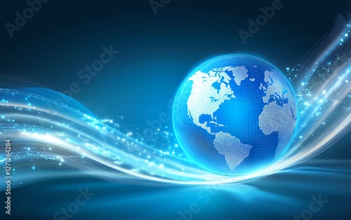 Virtual blue Earth globe hologram with dynamic data flow in the background, geometric mesh lines and circles, global internet network and cyberspace connection visualization