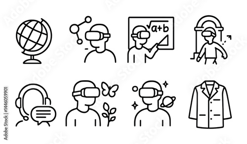 Virtual reality education icons set – outline style learning, technology, and innovation symbols for digital classrooms: globe, vr headset, equation board, science, educator