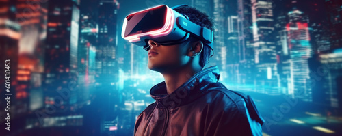 virtual reality helmet. man wearing a vr headset in front of a city skyline. Generative Ai