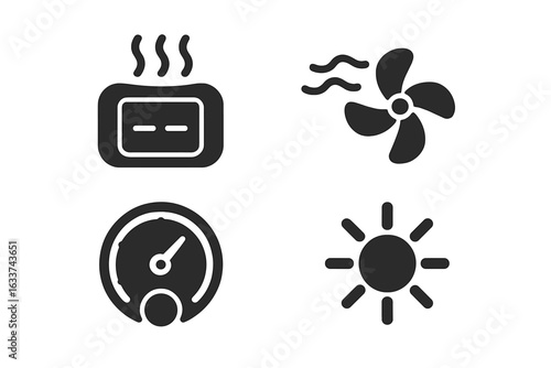 Virtual Reality Thermal Feedback Icons Set. Solid Filled Style Heat Patch, Cooling Breeze, Temperature Dial, Sun Warmth Vector Symbols for VR Haptic Interface, Immersive Digital Interaction
