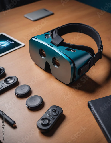 Virtual Reality VR googles set with accessories on wooden table