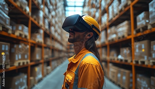 Virtual Reality-Enhanced Warehouse Training, workers using VR headsets to train in a fully immersive, simulated warehouse. Show virtual tools,
