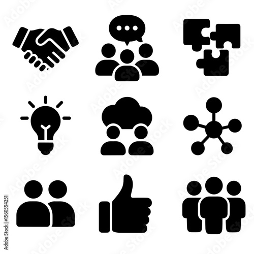 Virtual Teamwork Icons. Solid, filled icon set of virtual teamwork: handshake, group chat, puzzle pieces, light bulb,