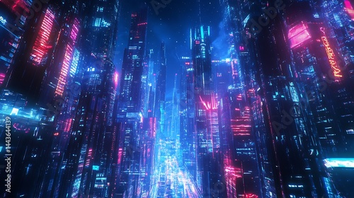 Virtual world illuminated by glowing neon lights and high-tech buildings