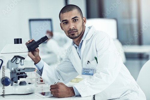 Vision, discovery and thinking scientist leading with innovation and modern science in lab. Portrait of young biologist analyzing medical sample with microscope, on mission for cancer or corona cure