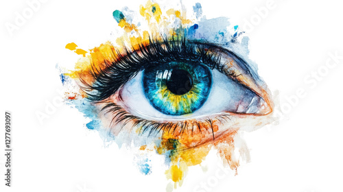 Vision Unveiled: A captivating close-up showcases a vibrant, artistic eye with mesmerizing blue and yellow hues, surrounded by a splash of watercolor paint, suggesting sight, insight.