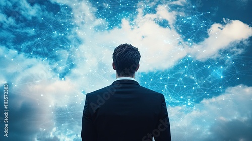 Visionary Leader: Businessman Overlooking a Futuristic Digital Cityscape