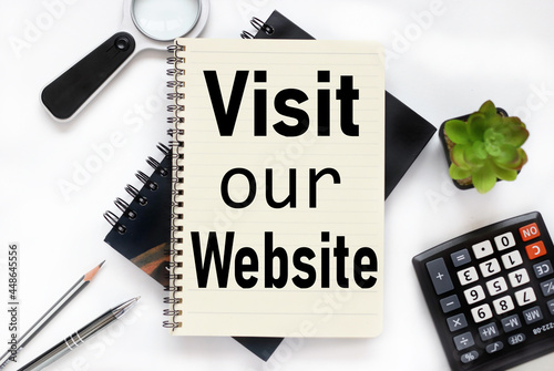 Visit Our Website, an open notebook lies on a closed notebook near a calculator and a magnifying glass on a white workspace.