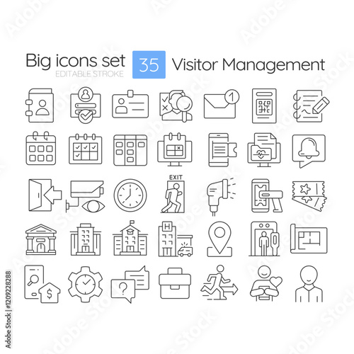 Visitor management linear icons set. Personal information, privacy. Surveillance tracking, monitoring. Customizable thin line symbols. Isolated vector outline illustrations. Editable stroke