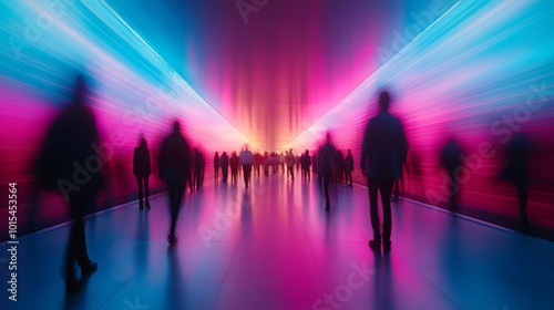 Visitors navigate an abstract gallery illuminated by neon blue and pink lights reflecting off smooth white walls, creating an energetic atmosphere