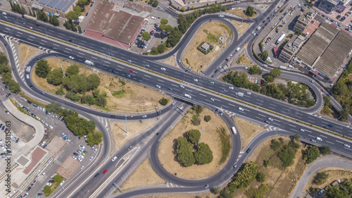 Vista aerea di un uscita autostradale a roma. Le auto corrono veloci lungo l'autostrada mentra alcune si stanno immettendo o ne sta uscendo tramite la corsia di accellerazione o decellerazione.