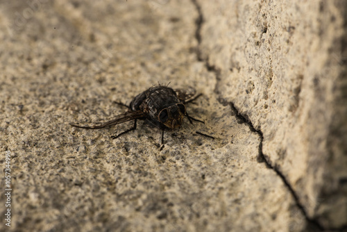 vista macro della carcassa di mosca nera morta e ferma su un pavimento di cemento