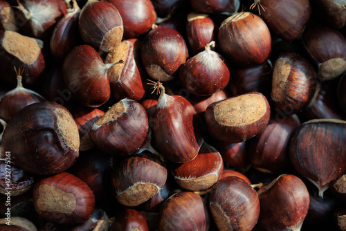 vista macro di un raccolto di castagne mature di grandi dimensioni in autunno
