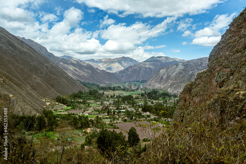 Vista panorámica a detalle frontal de montañas y Valle sagrado de los incas en Urubamba, Cusco. Perú.