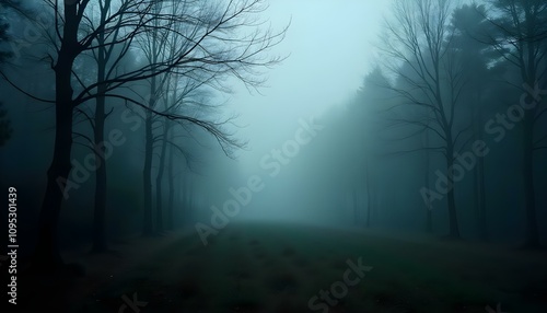 Vista panorámica de un bosque oscuro y brumoso, atmósfera misteriosa y sombría