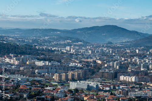 Vista parcial da encantadora cidade de Braga, capturada a partir do icônico Bom Jesus do Monte. A paisagem revela a harmonia entre a arquitetura urbana e o verde das colinas, destacando o charme histó