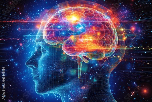 Visual abstraction sensory overload and neuronal discharge glowing digital brain with intricate neural pathways against a backdrop of cosmic patterns and futuristic lights