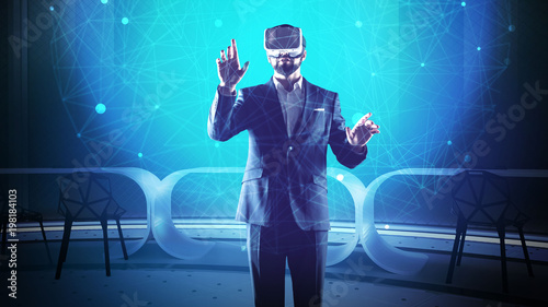 Visual aids. Calm serious young programmer looking concentrated while working with futuristic technologies and wearing modern virtual reality glasses
