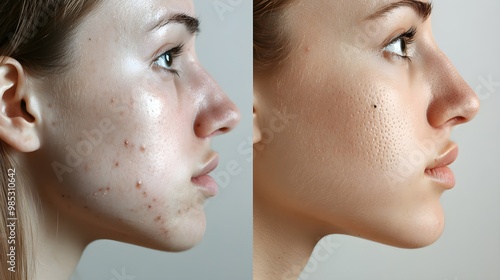 Visual comparison of a patient's nose and chin before and after deep cleansing, with a focus on blackhead-free skin and refined pores, Photorealistic, Soft Lighting