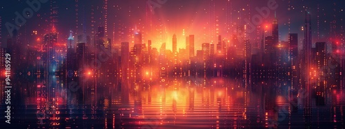 Visual representation of big data analytics with a cityscape made of binary code and data points