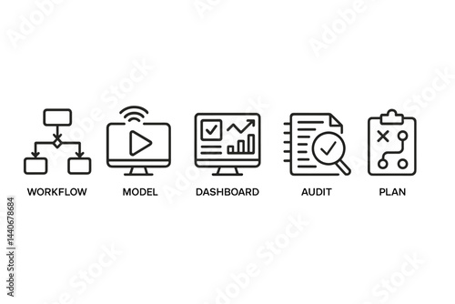 Visual representation of business processes including workflow, model, dashboard, audit, and planning activities for effective management