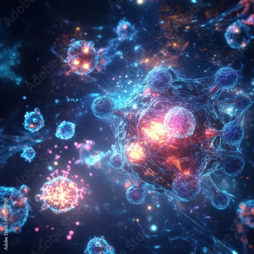 Visualization of antibodies actively targeting and neutralizing various pathogens in a vibrant digital representation. Generative AI