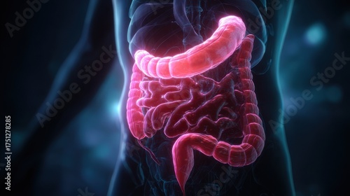 Visualization of the human digestive system highlighting the intestines and stomach details in vibrant colors