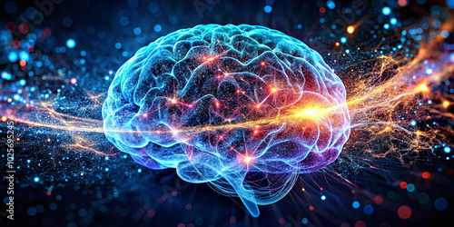 Visualization of wave-particle, Colorful and illuminated brain, black on a dark background