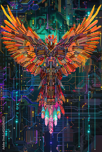 Visualize the intricate circuitry of a Cyber Phoenix in a vibrant pixel art style, showcasing its electric feathers from a top-down perspective