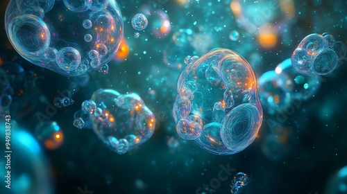 Visualizing microscopic structures: cell membranes, fluids, molecules, and water bubbles. A blend of biology, physics, and chemistry for an abstract backdrop.