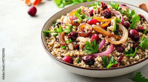 visually captivating layout featuring freekeh salad with caramelized onions and cranberries placed on solid white background