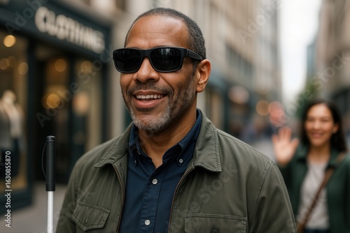 Visually Impaired Man Walking with White Cane in Urban Street Setting with Assistance from AI Technology
