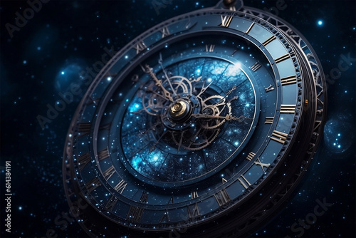 Visually striking image of a clock in space, symbolizing the concept of time in a cosmic context.
