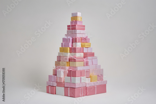 visually striking tower made of gifts meticulously wrapped in ultrabright colors