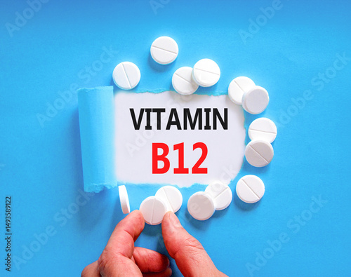 Vitamin B12 symbol. Concept words Vitamin B12 on beautiful white paper. White pills tablets. Doctor's hand. Beautiful blue background. Medical healthy lifestyle Vitamin B12 concept.