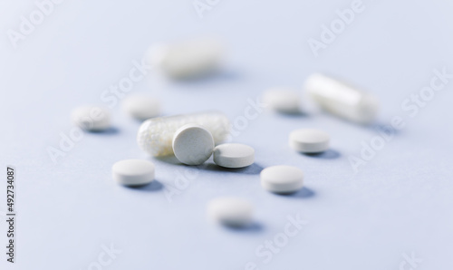 Vitamin C tablets and capsules on bright paper background. Soft focus. Close up. Copy space.