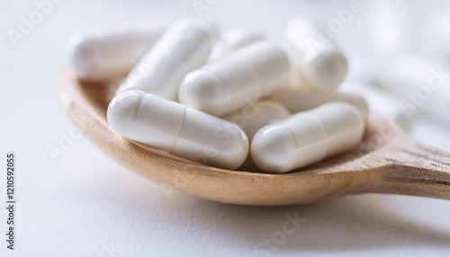 Vitamin capsules on wooden spoon. Healthy lifestyle. Mineral supplement, antioxidant. Medicine
