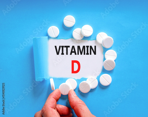 Vitamin D symbol. Concept words Vitamin D on beautiful white paper. White pills tablets. Doctor's hand. Beautiful blue background. Medical healthy lifestyle Vitamin D concept.