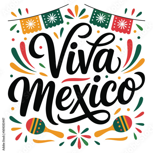 Viva Mexico lettering Design with Happy Cactus, Sombrero, Maracas, Chili Peppers Flag. Fun Cartoon vector Illustration for Independence Day Cinco de Mayo Fiesta Patriotic Mexican Culture tshirt tee