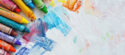 Vivid array of hand drawn wax crayon strokes on a textured white background with ample copy space image