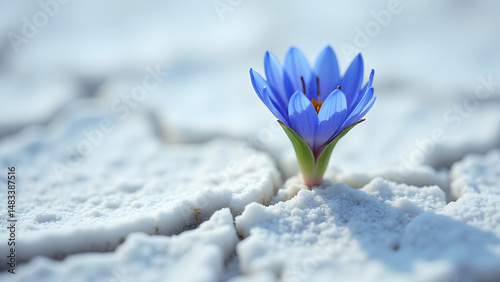 Vivid blue flower on white salt soil, extreme color contrast, delicate desert life concept.