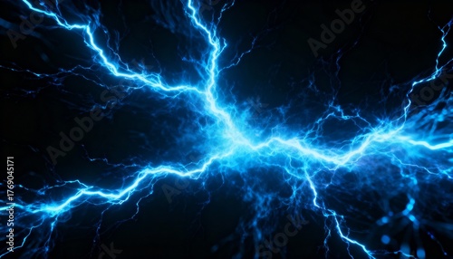 Vivid blue lightning bolt striking with intense electrical energy across a dark night background. Abstract concept of power, technology, plasma, and high voltage electricity.