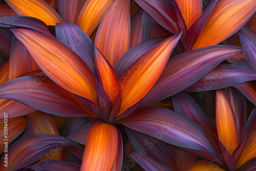 Vivid close-up of vibrant purple and orange plant leaves, showcasing intricate textures and rich colors. Ideal for design, nature, and botanical projects.