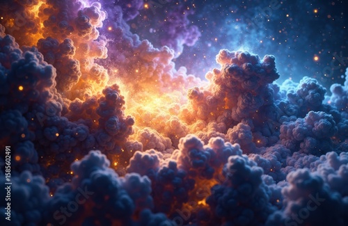 Vivid cosmic clouds illuminated by bright light in a colorful night sky
