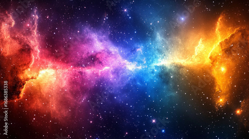 Vivid cosmic nebula glowing with colorful stars and radiant light patterns in deep space. Abstract celestial background ideal for science, astronomy, space art, and futuristic digital designs.