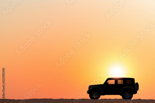 Vivid desert sunset with vehicle silhouette against colorful sky