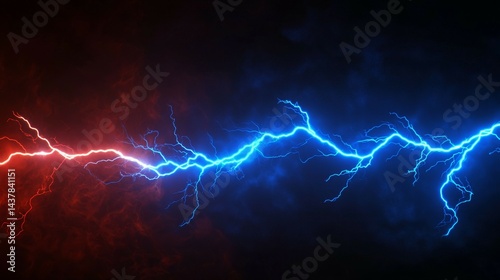Vivid Digital Artwork of Electric Lightning Strike with Branching Tendrils in Contrasting Red and Blue Stormy Background, Dynamic Energy Surge for Creative, Artistic and Scientific