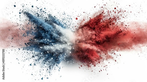 Vivid explosion of red, white, and blue powder particles creating a dynamic and colorful abstract image on a white background.