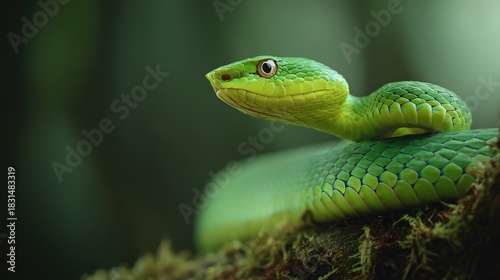 Vivid green arboreal reptile displays coiled posture on natural perch