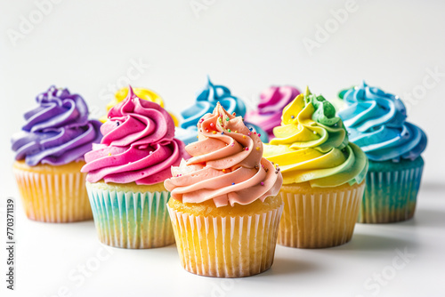 Vivid image showcasing cupcakes with a variety of frosting colors set against a pristine white background